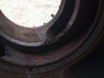 (2)2號隔板端面***大磨損深度0.60mm,修復(fù)外圓徑φ358.888mm,修復(fù)后的葉輪凸臺高出端面未磨損基準(zhǔn)面0.5mm,修復(fù)面積65.27dm2。